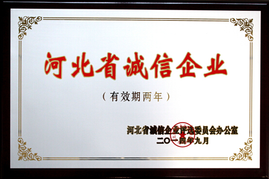 為深入貫徹落實科學發展觀,大力倡導誠實守信光榮、見利忘義可恥的良好風尚,進一步推動企業誠信建設,規范以誠信生產、誠信經營為核心的市場經濟秩序,依照相關文件精神,在河北省社會信用體系建設領導小組的指導下,河北省誠信企業評選委員會辦公室和河北省企業家協會會同省有關部門聯合組織開展了“河北省誠信企業”評選活動,經企業申報、基層相關部門審查推薦、省相關主管部門復審、評審專家委員會審核評選、社會公示等程序,我公司從上千家申報企業中脫穎而出、喜獲殊榮。2014年9月26日,在河北省企業誠信建設交流會上,公司代表參加隆重儀式并登臺光榮接受牌匾。