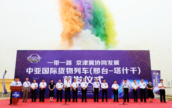 邢臺市市委書記張古江宣布“好望角號”中亞國際貨運(yùn)班列鳴笛開行。滿載100個(gè)標(biāo)準(zhǔn)集裝箱的貨物,一路向北向西,在霍爾果斯口岸出境,行程5000公里,8天后將直達(dá)烏茲別克斯坦首都塔什干。