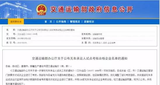 交通運輸部辦公廳關于公布無車承運人試點考核合格企業名單的通知
