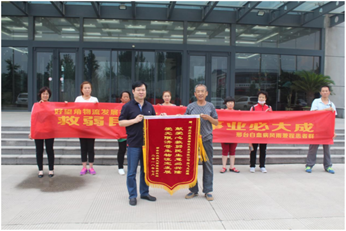 據統計,中國白血病的自然發病率為十萬分之七,在惡性腫瘤死亡率順位中排第6位,白血病已經成為嚴重影響中國城鄉居民健康和生命安全的疾病之一。超過75%的患者來自農村,家庭年收入不足3萬元。幾十萬到上百萬元的治療費用,讓許多家庭經濟困難的患者無法得到及時治療。我市隆堯縣蓮子鎮王家莊村王佳明、任縣西固城鄉南留寨村顏銀芳以及平鄉縣前召馬村趙俊省三位白血病患者,子女尚幼,家庭困難,已無力承擔高額的醫藥費。我公司得知此消息后,在邢臺市慈善總會的帶領下,積極對以上三位患者進行捐助,以解其燃眉之急。病魔無情人有情,關愛生命、情滿人間,好望角的點滴付出匯成愛心的暖流,為三位白血病患者筑起一道生命的長城。點滴鑄真情、分毫顯愛心!30000元的捐款也許對于白血病患者巨額的醫藥費只是杯水車薪,但我們相信大家的關心、友愛的胸懷定能幫助他們戰勝眼前的困難!7月11日,受助代表專程來到好望角,給公司董事長吳清杰贈送錦旗,以示感謝!